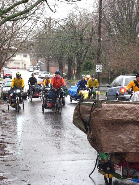 Photo: Moving – by bike. Bicyclists in Portland, Ore., brave the rain to help each other move by bike. Taken Feb. 2, 2008, by Axcordion http://commons.wikimedia.org/wiki/File:Moving_by_bike.jpg