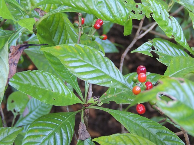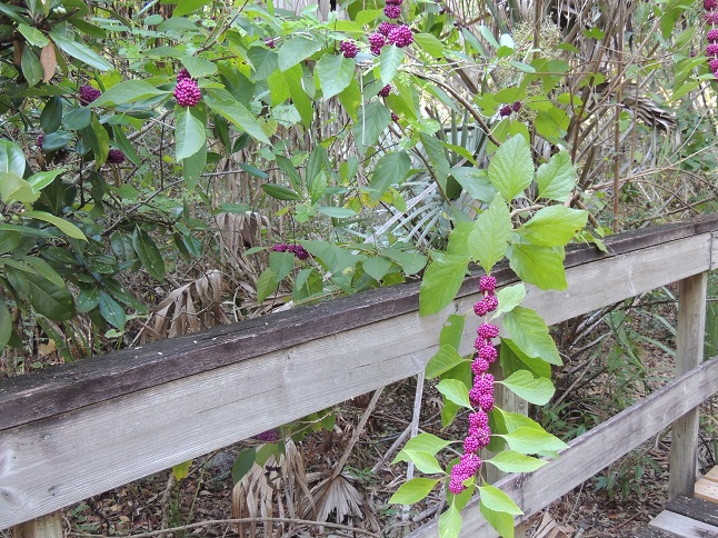 On our way out, we pass a shrub with wild olives among its dark evergreen leaves. A wild coffee shrub, with glossy leaves, has dark red berries. These berries were used by early Florida pioneers to brew a caffeinated drink.