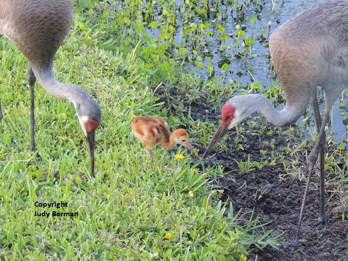 6. Photo: Sandhill crane chick, Frasier Crane, and parents, Ichabod and Abbie – taken June 26, 2014 by Judy Berman. (Frasier was born 6-21-14)