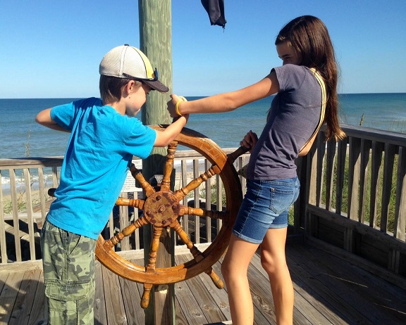 4.Photo: Exploration Tower – Port Canaveral, Florida – Connor and Kaitlyn piloting and navigating a boat using a simulator thru Canaveral Harbor to greet a cruise ship.