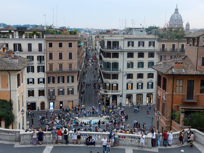 Throngs of people and vendors crowd the steps. We avoid the hassle of threading our way to the top by taking a side street to the Spanish Steps. Two already are at the top waiting for us. (Photo above)