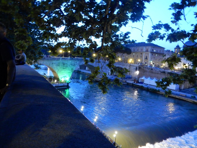 After we left, we walked over to the Tiber River. The lights are from a festival. We’d seen the white tents set up days before. Now, there were people dining along the river, buying art, and having a great time.