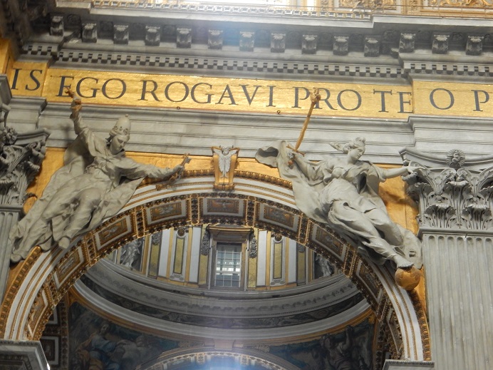Along the base of the inside of the dome in St. Peter’s Basilica is an inscription in Latin of quotes from Jesus to Peter in the Bible. It translates to: “You are Peter, and on this rock, I will build my church, and the gates of the underworld can never overpower it. I will give you the keys to the kingdom of heaven.” (Matthew 16:18)
