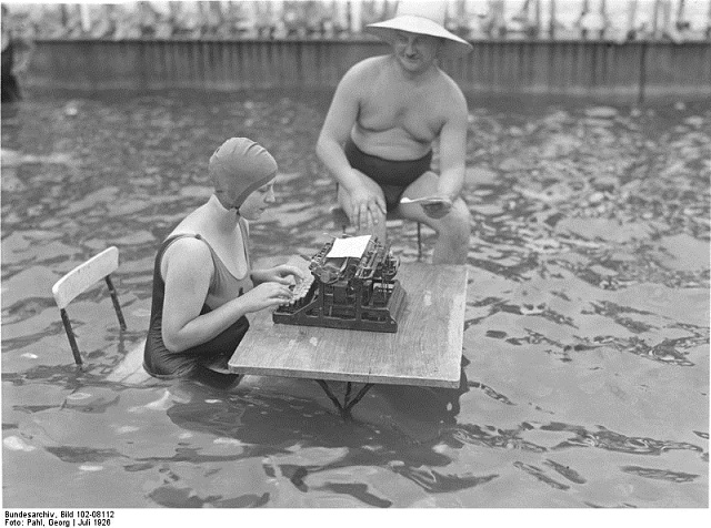Photo: Jobs: Secretary typing while boss is giving dictation. Photographer: Georg Pahl (1900-1963). Attribution: Bundesarchiv, Bild 102-08112 / Georg Pahl / CC-BY-SA 3.0 https://upload.wikimedia.org/wikipedia/commons/5/5e/Bundesarchiv_Bild_102-08112%2C_B%C3%BCro_im_Wasser.jpg